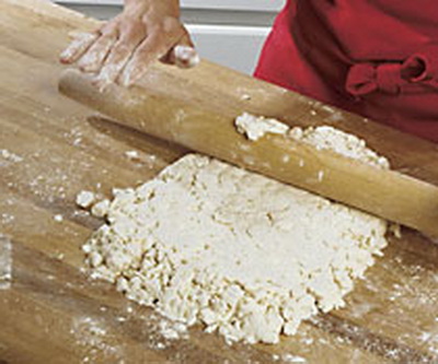 Dust the work surface and begin rolling out the crumbly dough into a 6 x 18 inch rectangle. Using the pastry scraper, fold the two short sides to the center; then fold the bottom end to the top, like closing a wallet.