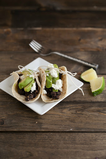 To assemble tacos, place 1/4 of the black bean mixture in the center of the tortilla, layer avocado and goat cheese on top. Finally, whisk together juice and zest from half a lime along with honey. Lightly drizzle over taco filling.