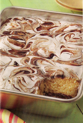 Spoon teaspoonfuls of marshmallow creme onto warm cake; carefully spread with knife dipped in hot water. Drop small dollops of reserved hot fudge topping randomly over marshmallow cream. Swirl topping through marshmallow creme with knife for marbled desighn. Cool 2 hours. Store uncovered at room termperature. Once cut, store cake in the pan, uncovered, with plastic wrap pressed against cut sides.