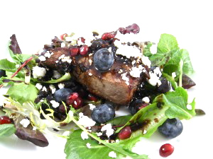 This exquisite steak salad looks and sounds gourmet, yet so simple to make. Picture tender lean fillets, plump juicy blueberries, crisp pomegranate seeds and fat-free feta cheese all on top of a bed of field greens drizzled with a gorgeous pomegranate-blueberry balsamic reduction sauce. Don’t worry that you might be ruining your nice steaks. This fruity reduction sauce taste amazing drizzled over the steak and equally over the greens.
