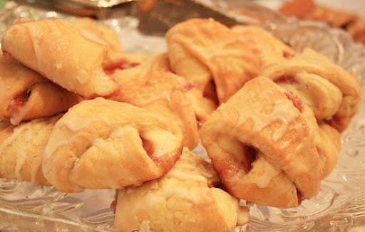 Unroll crescent roll triangles on greased cookie sheet. Drop a good tablespoon of cheese filling on wide end. Drop about a teaspoon of strawberry preserves on top of the cheese filling. fold both short corners over filling meeting in the center. pull long triangle end over both and tuck under.