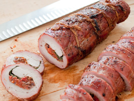 Butterflying and pounding the pork in our grilled pork tenderloin recipe created a larger surface area for the filling, which we rolled up inside the pork tenderloin before trussing to prevent leakage. A traditional bread stuffing oozed out of the pork as it cooked, so we opted to fill our grilled stuffed pork tenderloin with a robustly flavored paste. We grilled the tenderloin over a modified two-level fire and rubbed some brown sugar onto its exterior. This gave our grilled stuffed pork tenderloin a moist interior and a perfectly browned crust.