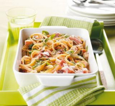 Add pasta, peas, bacon, chicken, half and half, cheese, pepper and salt to skillet; toss well to coat.