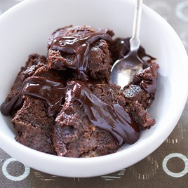 4. Transfer soaked bread mixture to prepared pan and pour chocolate custard mixture evenly over bread. Bake until pudding is just set and surface is slightly crisp, about 45 minutes. Let cool 30 minutes. Warm reserved chocolate mixture over low heat, then pour over bread pudding. Serve. (Leftover bread pudding should be refrigerated; reheat individual portions in microwave.)