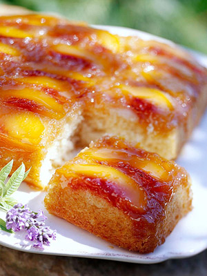 Place 1/4 cup butter in an 8x8x2-inch baking pan. Warm in a 350 degrees F oven about 5 minutes or until butter is melted. (Be sure to watch carefully to avoid overbrowning the butter). Remove pan from oven. Add brown sugar, stirring until sugar is completely moistened. Spread sugar mixture evenly in pan. Arrange peach slices evenly over brown sugar mixture. Set aside.