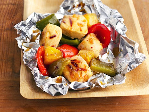 Cut 4 (24x12-inch) sheets of heavy-duty foil. Divide chicken, bell peppers, pineapple chunks and pineapple preserves mixture among foil sheets. Sprinkle with salt. Bring up 2 sides of foil so edges meet. Seal edges, making tight 1/2-inch fold; fold again, allowing space for heat circulation and expansion. Fold other sides to seal.