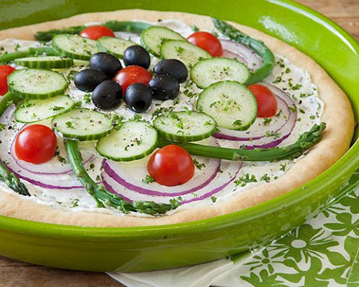 Spread crust with cream cheese. Arrange vegetables in a decorative pattern. Sprinkle with parsley and Salad Supreme, if desired.