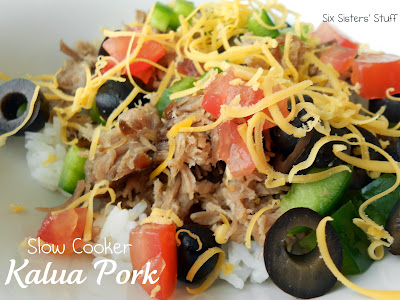 We serve it over rice (either brown or white) and put meat on top. We then put chopped green peppers, tomatoes, onions, olives, banana peppers, cucumbers, and cheese on top- you really could add any kind of vegetables that you like! Jared likes to eat it just like this, but I always like to add just a tiny bit of sauce, like Hawaiian BBQ sauce or teriyaki sauce. Super easy and super good!
