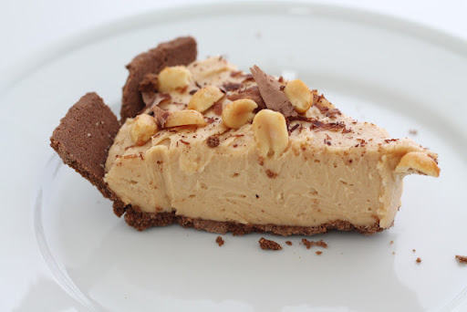 In a mixing bowl, beat whipping cream, gradually increasing speed. Once it is stiff and forming soft peaks, blend in powdered sugar, a half cup at a time. Add peanut butter, blend. {Warning: do not taste...if you do, you may never get to the next step...there's not much better to me than peanut butter cream}. Last, add cream cheese. Scoop batter into your crust, smooth, garnish and refrigerate 2 hours before serving. {Shown with chocolate shavings and roasted peanuts}.