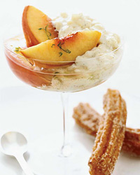 Chilled Peaches with Arborio Rice Pudding and Cinnamon Churros