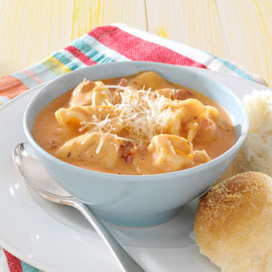 Meanwhile, in a Dutch oven, combine the soup, broth, milk, cream, tomatoes and seasonings. Heat through, stirring frequently. Drain tortellini; carefully add to soup. Stir in cheese. Sprinkle each serving with additional cheese if desired.