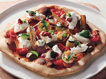 Working quickly, spread generous 1/2 cup canned tomatoes over dough, leaving about a 1/2-inch border. Drizzle very lightly with oil and sprinkle with salt. Slide pizza onto stone. Bake until edge of crust is crisp and golden, about 7 minutes. Meanwhile, break eggplant pieces into halves or thirds.