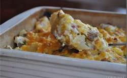 Boil potatoes in jackets; cool completely. Peel and shred potatoes; mix with other ingredients except paprika. Put into baking dish. Sprinkle paprika on top. Bake at 375 degrees for 30 minutes. Note: May prepare and refrigerate day before; bake before serving.