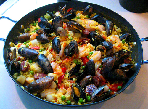 8. When the rice is close to being done, stir and add the clams and mussels (submerge in as much liquid as possible). Cook for about 10 minutes.