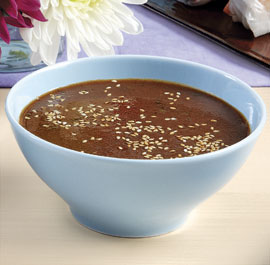 In a small bowl, dilute the tapioca starch or cornstarch with 2 Tbs. water. Whisk into the sauce, and then cook, whisking, until thickened, about 2 minutes. Stir in the scallion and cilantro and sweeten to taste with more honey, if necessary. Remove from the heat and cool to room temperature (the sauce will thicken further as it cools). Skim any fat from the surface and discard. Garnish with the sesame seeds.
