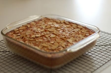 Step 2: In a separate bowl, combine flours, salt and baking powder. Beat the dry ingredients into the wet ingredients and beat until creamy. Spread into a greased 9x13-inch cake pan top with almonds and bake at 350°F for 30 minutes. Serve with fresh fruit and whipped cream.