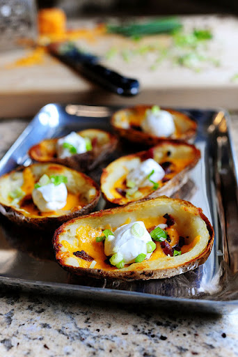 Remove from oven. Sprinkle the insides of the potato skins with Cheddar, then sprinkle on the chopped bacon. Return to the oven long enough for the cheese to melt, about 3 to 4 minutes.