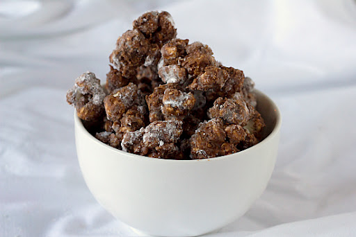 4. Sift the powdered sugar over the chocolate-covered popcorn and stir until each piece is evenly coated. Spread the mixture out onto a baking sheet and place in the refrigerator for about 30 minutes or until the chocolate is set.
