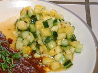 Thinly slice cucumber halves crosswise. Transfer to large glass bowl. Thinly slice zucchini halves crosswise and add to bowl. Add pineapple and toss.