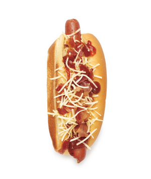 Place a hot dog in each bun and, dividing evenly, top with the barbecue sauce, Cheddar, and bacon.