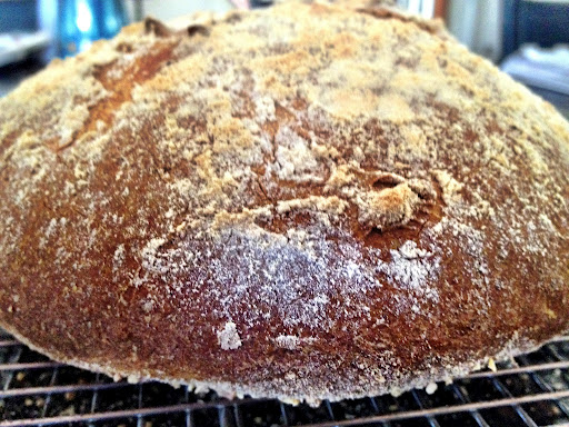 5. Place the baking sheet into the oven (or slide the dough onto your baking stone). Pour 1 cup of hot tap water into the broiler tray, quickly close the oven and bake for about 35 minutes. The top should get a good hard crust and will be deeply browned. Allow to cool on a cooling rack and brush off excess flour from the top of the loaf before slicing.