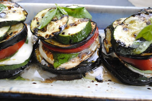 As soon as vegetables come off the grill, assemble napoleons in the following order: 1 slice eggplant, 2 to 3 slices of zucchini, 1 slice mozzarella, a few basil leaves, a tomato slice, another eggplant slice and a few more zucchini slices. Lightly drizzle napoleons with remaining tablespoon of olive oil and the balsamic vinegar. Serve.