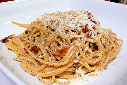 Add egg mixture to pasta along with bacon, spinach, 1/2 cup Asiago, and parsley. Cook over medium heat 1 minute just to heat through, tossing with tongs to combine. Add reserved pasta cooking liquid as needed to make creamy. Top with hard-cooked egg, Asiago, and black pepper.