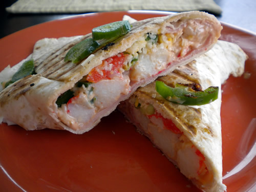 3. Divide crab meat over each tortilla. Add tomato slices and cheese. Fold tortilla up into a wrap.
