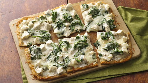 Bake 10 to 12 minutes or until edges are beginning to brown. Meanwhile, in medium bowl, mix Alfredo sauce and chicken; spoon evenly over partially baked crust. Top with spinach, mushrooms and cheese. Return to oven and bake until the cheese is melted and bubbly, about 10 minutes.