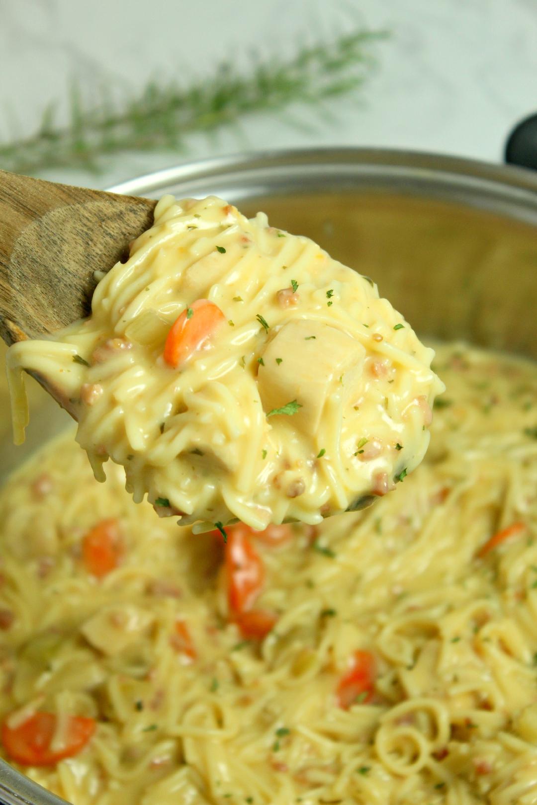 Combine chicken, condensed soup, chicken stock, milk, cream cheese, carrots, celery, ranch dressing mix, and crumbled bacon in a large Dutch oven over medium-high heat and bring to a boil.