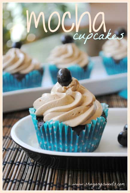 Pipe frosting onto cooled cupcakes and garnish with chocolate covered espresso bean (if desired).