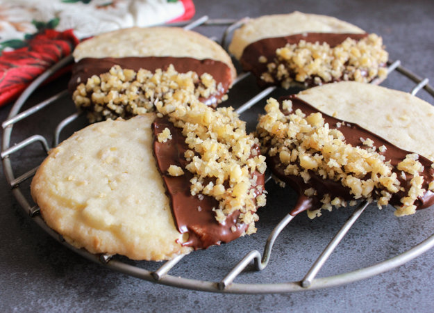 Dip the cookies in chocolate and then chopped hazelnuts and let cool until the chocolate is set, enjoy them plain, or spread them with a little Nutella before eating.
