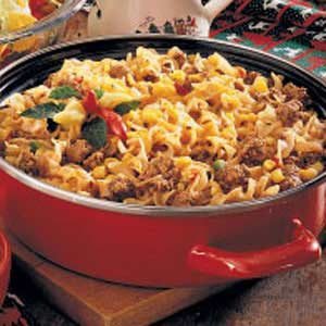 •Drain the noodles; add to beef mixture. Stir in the corn, salt and pepper. Sprinkle with cheese; cover and cook until heated through and cheese is melted. Yield: 8-10 servings.
