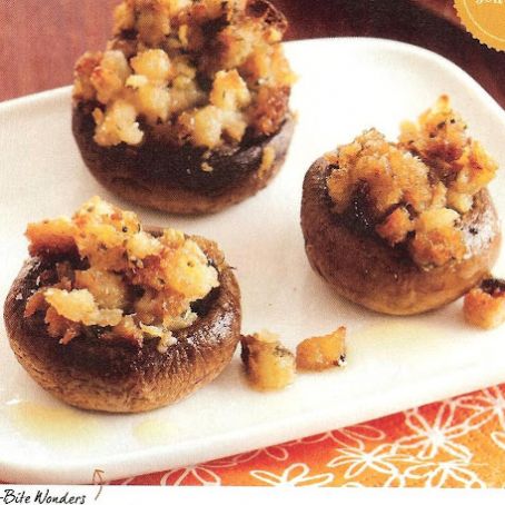 Fill mushroom caps with stuffing. Place on a rimmed baking sheet, sprinkle with cheese and drizzle with EVOO. Bake at 375 degrees for 20 minutes. Serve hot.