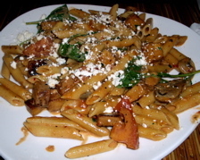 Heat a large sauté pan. Add the olive oil, garlic, mushrooms and spring onions. Stir well. Add tomato sauce when the mushrooms, garlic and onions are sizzling and lightly caramelized. Add salt and crushed chile flakes to taste. Add cream, then the pasta and toss to coat. Pour onto a platter. Finish with fresh sliced basil. Garnish with grilled asparagus spears and shaved Asiago cheese.