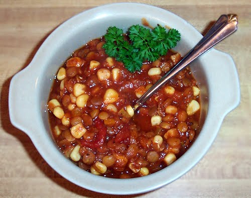 1. Combine all the ingredients (except the corn and tomato sauce) in a 2 1/2 quart pot and boil over high heat.