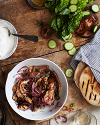 Heat the pita breads in the oven, about 30 seconds. Set the pitas on plates and top each one with a lettuce leaf, tomato wedges and cucumber slices. Spoon the chicken in yogurt sauce on top and serve right away.
