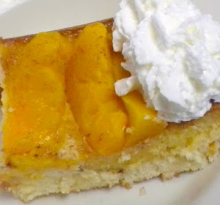 Mix together well and spoon on top of peaches making sure you leave a one inch edge around the pan