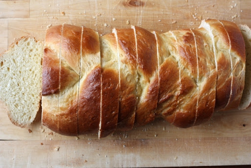 Punch down dough and divide into 6 equal portions. Roll each portion into rope-like pieces and braid into two braided loaves, pinching and tucking the ends under. Place dough on paper lined sheet pan. Let rise until doubled again, about 45 minutes.