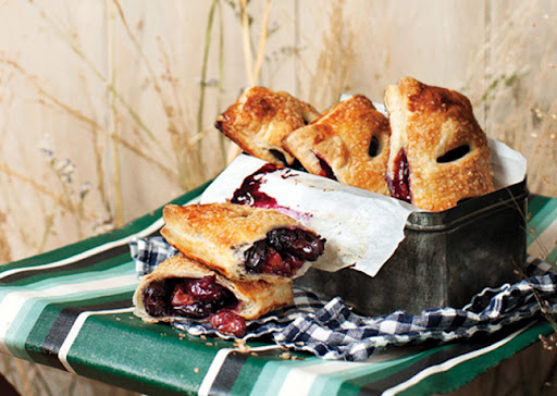 Working with 1 pastry rectangle at a time, place on a work surface and brush edges with egg wash. Scoop 3 tablespoons cherry mixture onto one side; fold dough over filling so that short ends meet, forming a 5x3" packet. Crimp edges with a fork to seal. Using a sharp knife, cut a few slits in top of pie to vent. Place on prepared baking sheet; repeat with remaining dough and filling.
