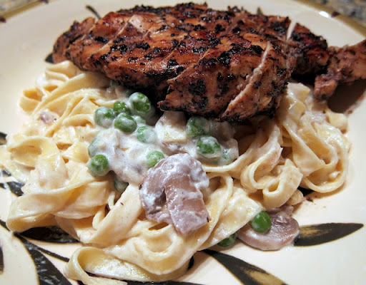 Carrabba's is one of our favorite chain Italian restaurants. We don't go very often, but when we do, we both really enjoy it. One of our favorite dishes is Pasta Carrabba - fettuccine alfredo with grilled chicken, sautéed mushrooms and peas. Chicken Legs loves everything about this dish. I hate the peas and mushrooms, but love the chicken and sauce (I'm like that).