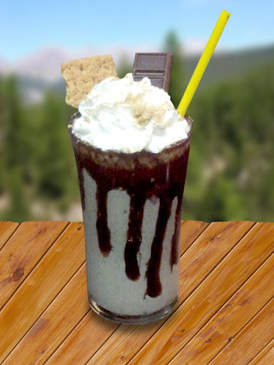 Rim glass with chocolate syrup and allow to run to bottom. Pour in milkshake. Top with whipped cream, a little more chocolate syrup, remaining graham crumbles, the golden marshmallow, 1/4 stick of Hershey's bar and 1/4 stick of graham cracker.