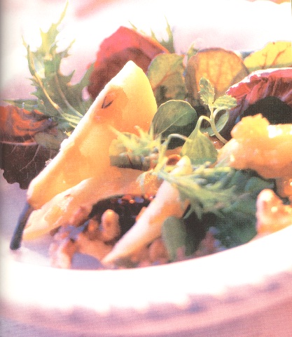 Pears and Field Greens in a Saffron-Walnut Dressing