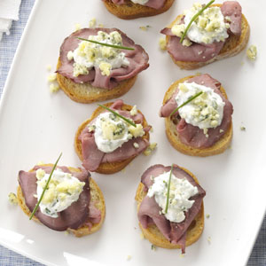 • Meanwhile, in a small bowl, combine the sour cream, chives, horseradish and salt. Top toasts with beef; dollop with sour cream mixture. Sprinkle with cheese and additional chives.