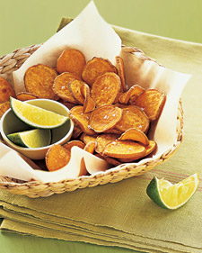 A mandoline or a hand-held slicer will quickly turn out thin, even slices of sweet potato, although a sharp knife and a steady hand will also work fine.