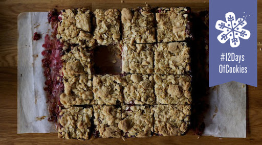 4. To the remaining flour-butter mixture, add the rolled oats and mix until combined. Sprinkle the crumbly oat topping over the cranberries, squeezing some of the mixture together to create large streusel-style knobs. Bake the cranberry bars until the topping is golden brown, turning the pan halfway through baking, about 35 minutes total. Cool completely in pan before grabbing a hold of both sides of the parchment sling. Lift from the pan and use a sharp knife to cut into individual bars.