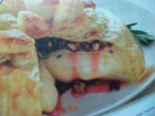 Thaw pastry sheet at room temp. 40 mins. or till it's easy to handle. Heat oven to 400. Beat egg and water in small bowl. Unfold the pastry sheet on lightly floured surface. Roll sheet into a 14-m square. Stir cherries, pecans, honey and rosemary in bowl. Spready cherry mix onto center of each square. Top w/ cheese, brush edges of pastry w/ egg mix. Fold two opposite sides over cheese. Trim remaining two sides of square to 2" from edge of cheese, fold sides up onto cheese and press edges to seal. Place seam-side down onto baking sheet. Decorate top w/ pasty scraps or additional rosemary, if desired. Brush w/ egg mix.