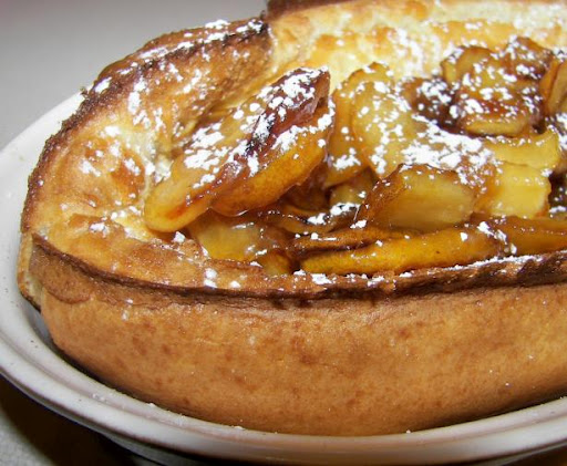 Pancake will puff into big bubbles while baking. Cut into wedges and serve with a sauce of melted butter, powdered sugar and lemon juice. Garnish with Apple Topping.