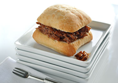 Tender enough to be shredded with a fork, pulled pork makes an easy buffet mainstay. Offer buns (to pile high with pork), pickled jalapeno peppers, shredded Cheddar cheese and light sour cream.