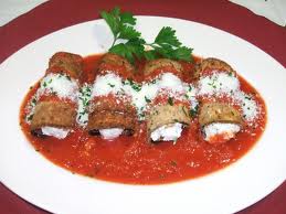Place a tablespoon of the cheese mixture on 1 end of the eggplant and roll up tightly. Place the eggplant rollatini into a greased (with olive oil) 13 by 9-inch baking dish, seam side down. Continue with remaining eggplant. Evenly distribute the tomato sauce on top of the eggplant rollatini. Season with salt and pepper. Sprinkle with remaining 5 tablespoons of Parmesan cheese and bake for 15 minutes. When cooked, drizzle the top with extra-virgin olive oil.